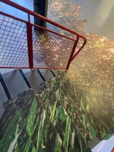 À partir de prises de vue réalisées dans les zones boisées du lycée et au Parc de Kerbihan, l’artiste crée des images déformées (anamorphoses, étirements, superpositions numériques) qui sont installées dans l’espace du quotidien du lycée, sur les murs et sols du bâtiment. Cette « colonisation » visuelle transforme l’architecture en un organisme envahi par une végétation fictive.
