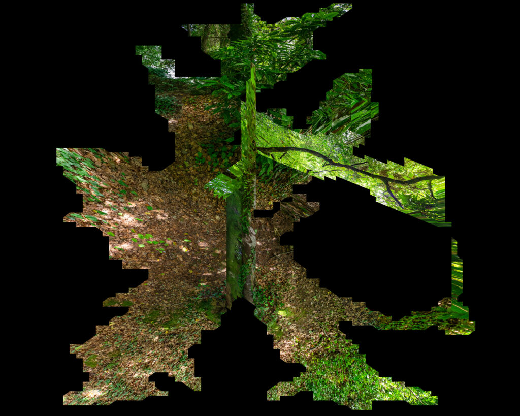 À partir de prises de vue réalisées dans les zones boisées du lycée et au Parc de Kerbihan, l’artiste crée des images déformées (anamorphoses, étirements, superpositions numériques) qui sont installées dans l’espace du quotidien du lycée, sur les murs et sols du bâtiment. Cette « colonisation » visuelle transforme l’architecture en un organisme envahi par une végétation fictive.